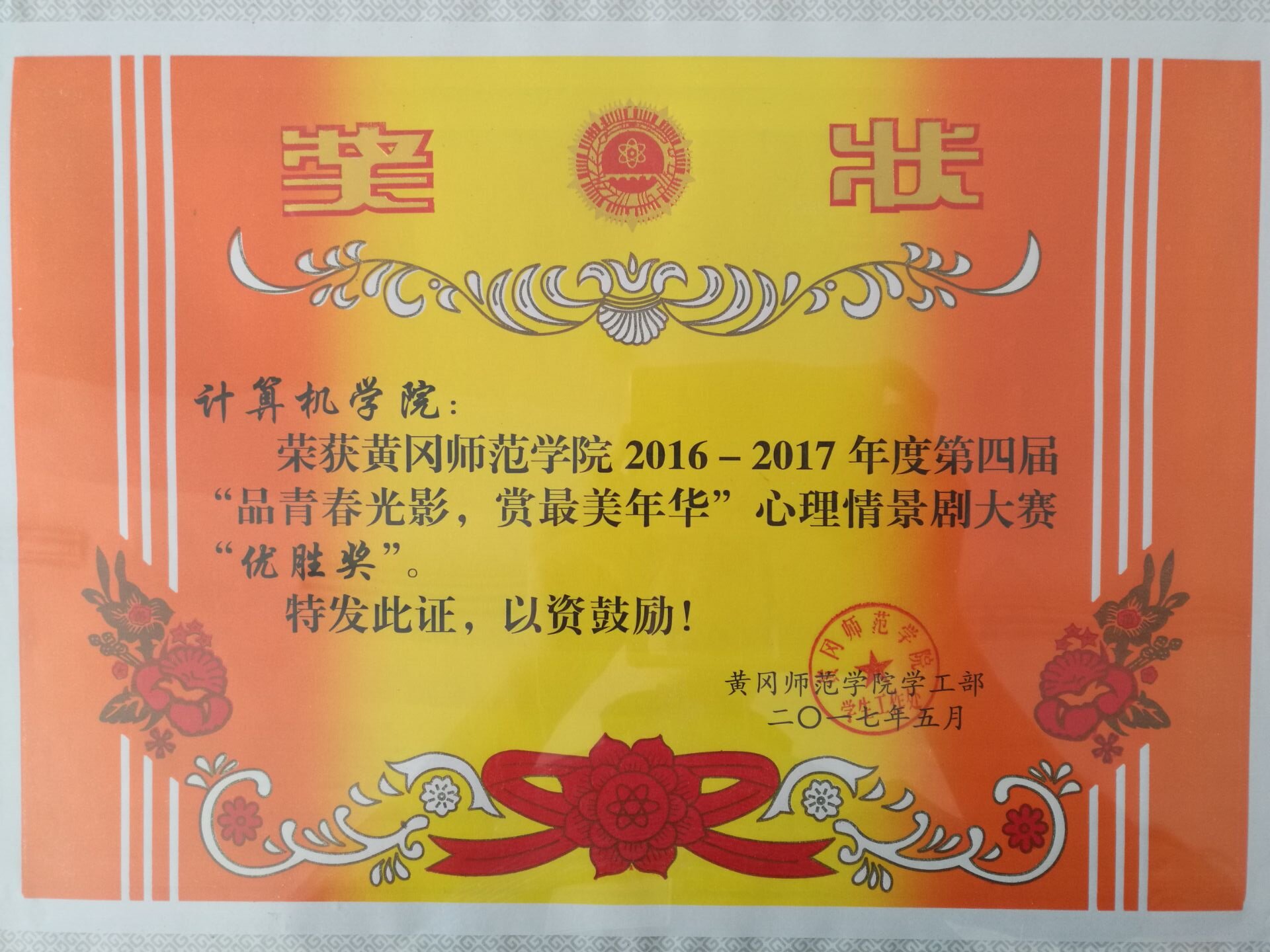计算机学院获伟德国际victor19462016-2017学年度第四届“品青春光影,赏最美年华”心理情景剧大赛“优胜奖”,李磊和梅伊玲两位同学分获“优秀心理委员”称号。