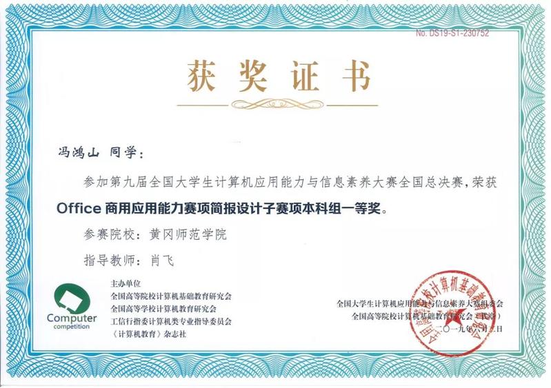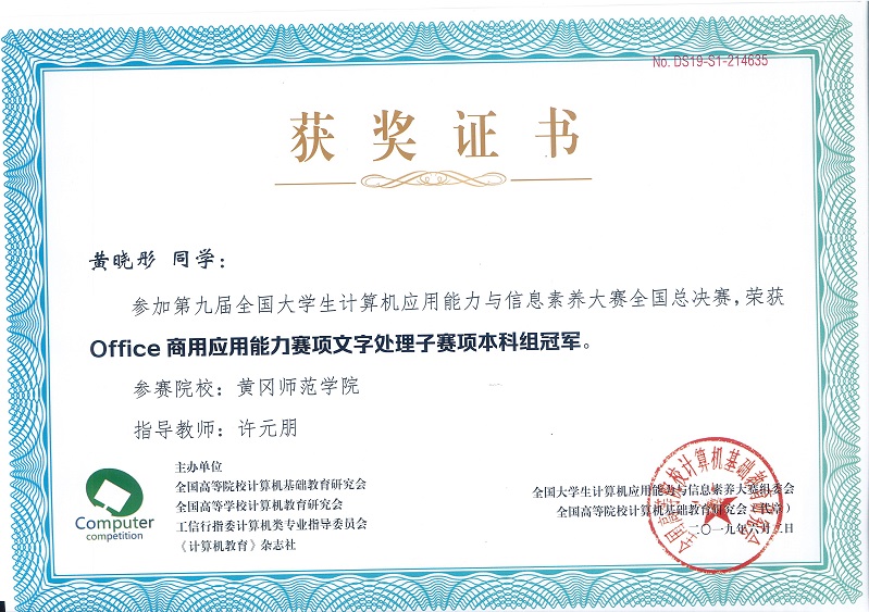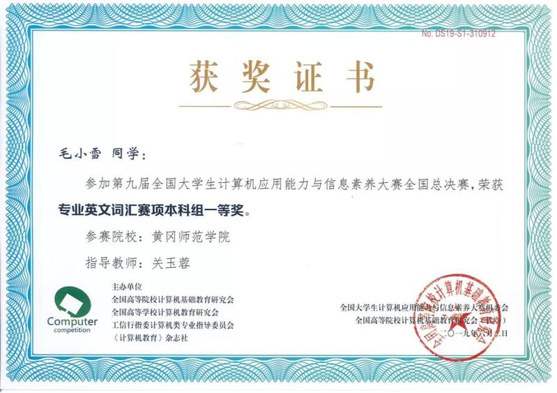 6月2日,第九届全国大学生计算机应用能力与信息素养大赛在首都经贸大学圆满落幕。我校学子获得一等奖3项,二等奖1项,三等奖9项。其中,我校计算机学院关玉蓉老师指导的学生毛小雪在专业英语赛项中荣获本科组个人一等奖、许元朋老师指导的学生黄晓彤在office商务应用能力赛项中荣获本科组个人一等奖、肖飞老师指导的学生冯鸿山在office商务应用能力赛项中荣获本科组个人一等奖,其中,毛小雪、黄晓彤同学分别在所参赛项中取得了第一名的优异成绩。