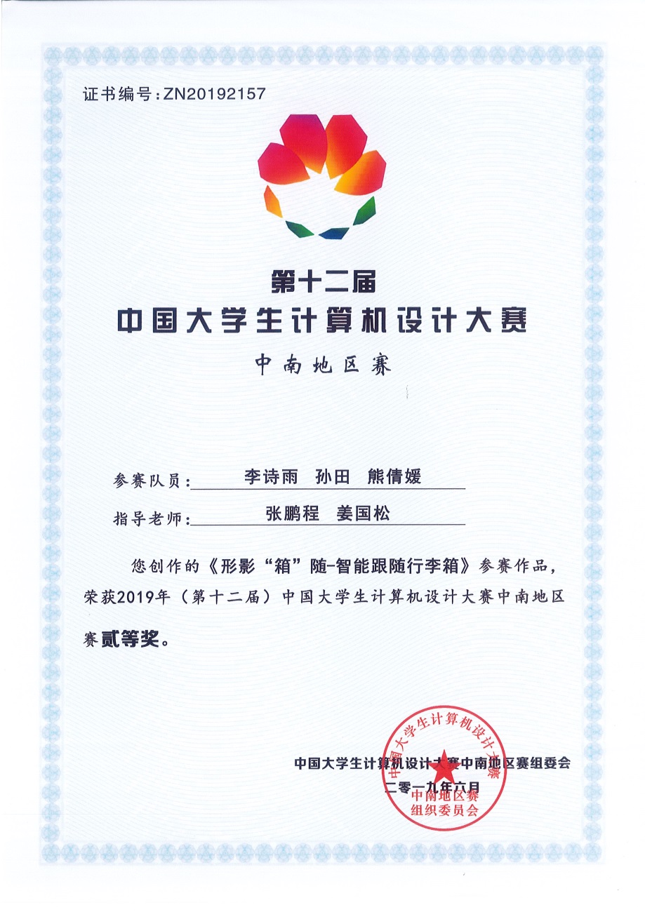 近日,第十二届中国大学生计算机设计大赛中南地区赛落幕,我校学子获得二等奖2项,三等奖3项。其中,我校计算机学院段宗曜、胡志华老师指导的学生曹文榜,崔鬓,吴涛的算法设计应用类作品《弃趣2.0》荣获本科组二等奖;张鹏程、姜国松老师指导的学生李诗雨,孙田,熊倩媛的物联网应用类作品《形影“箱”随-智能跟随行李箱》荣获本科组二等奖;杨改贞、周芬老师指导的学生张艺,赵梦琪,左彬的微课与教学辅助类作品《小通物流车—智能拉力机器人》荣获本科组三等奖的优秀成绩。《弃趣2.0》和《形影“箱”随-智能跟随行李箱》将代表我校参加全国决赛。