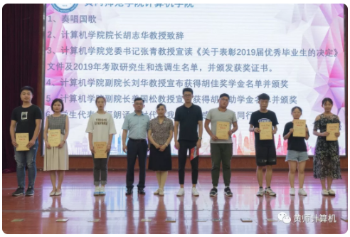 党总支书记张青宣读《关于表彰2019届优秀毕业生的决定》文件以及2019年考取研究生和选调生的名单并颁发证书。