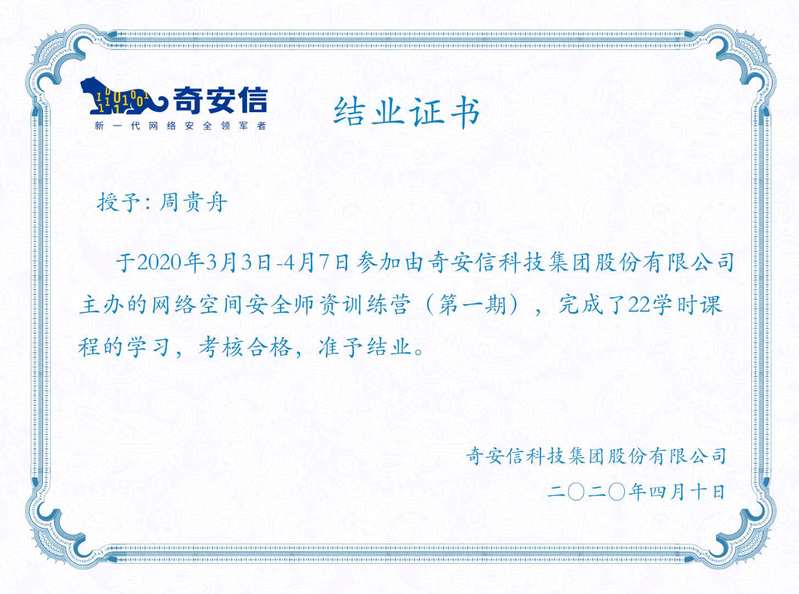 4月10日,计算机学院物联网工程专业教研室教师周贵舟通过奇安信科技集团股份有限公司主办的网络空间安全师资训练营(第一期)的全部测试,获得结业证书。在校企合作单位武汉艾迪时代网络技术有限公司的大力支持下,奇安信网络空间安全师资训练营吸引了全国近百所高校相关专业教师参加学习,周贵舟老师是通过测试的为数不多的学员之一。