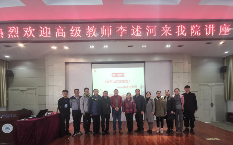 李述河老师以清唱一首《再见了,大别山》拉开讲座序幕,围绕大别山红歌、红安红歌,着重介绍了红安的地理位置、革命风貌以及人文情怀,弘扬了“一要三不要,一图两不图”、“朴诚勇毅,不胜不休”的红安精神。通过鉴赏《八月桂花遍地开》、《三大纪律八项注意》、《黄安谣》三首红色歌谣向我们描绘出了红安红军战士为家国奋战的壮丽场面,彰显了红安为中国革命所做出的突出贡献。