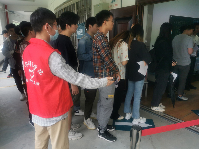 志愿者们认真发放材料并指导师生正确填写、热情解答、严谨信息登记,礼貌维护秩序,周到服务留观师生,树立了志愿者的良好形象。