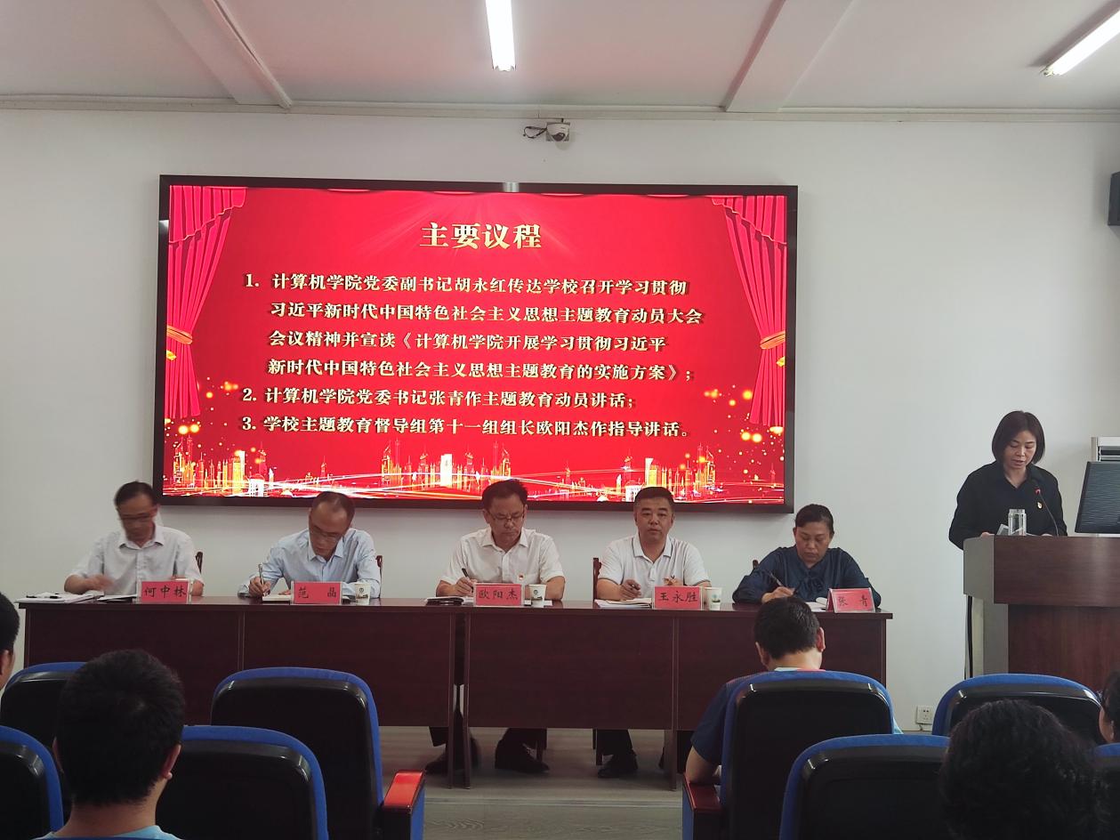 首先,计算机学院党委副书记胡永红传达学校召开学习贯彻习近平新时代中国特色社会主义思想主题教育动员大会会议精神,并宣读《计算机学院开展学习贯彻习近平新时代中国特色社会主义思想主题教育的实施方案》。