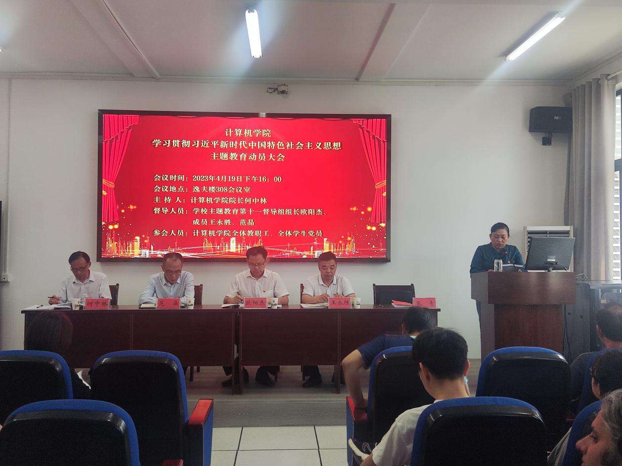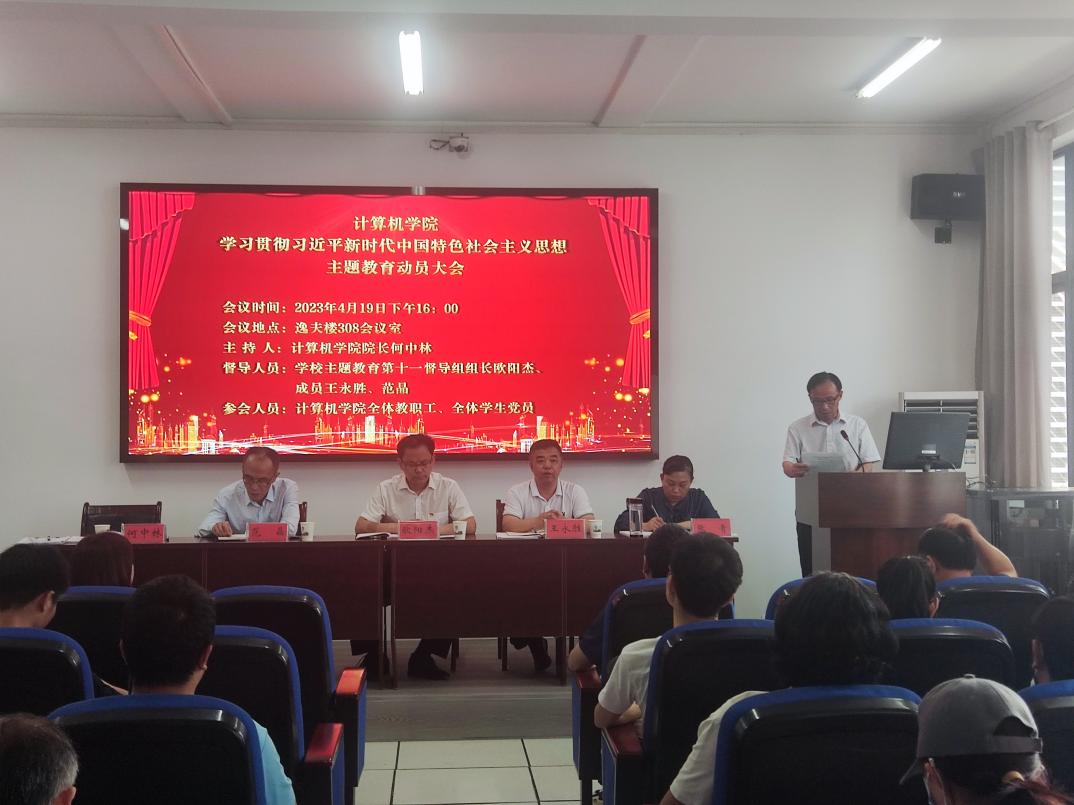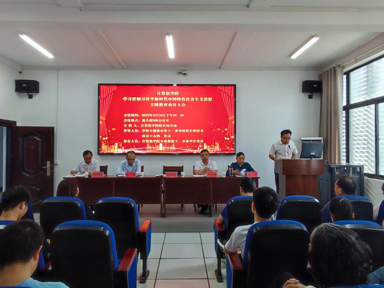 4月19日下午,计算机学院于逸夫楼308会议室召开学习贯彻习近平新时代中国特色社会主义思想主题教育动员大会。学校主题教育第十一督导组全体成员,计算机学院全体教职工,全体学生党员参加了大会,会议由计算机学院院长何中林主持。