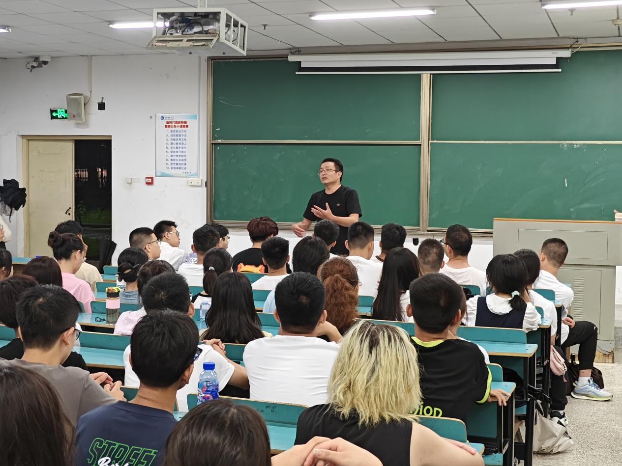 在讲到安全问题时,胡老师为新生讲解了国家、社会以及人身财产安全等,并向新生例举多种案例。首先,胡老师从国家利害关系等角度出发展开普及了国家安全知识,提醒大家要加强国家安全意识。接着,他向大家强调了宿舍防火和用电安全,并希望同学们防患于未然,积极掌握宿舍安全用电等常识,提高防火意识和自救能力。此外,胡老师详细概括了目前诈骗分子常见的诈骗手段,以防范电信网络诈骗,保护自身财产。最后,他强调当代大学生要树立正确消费观念,拒绝过度消费,明确拒绝“校园贷”,保护自身的权益和提高防范意识。