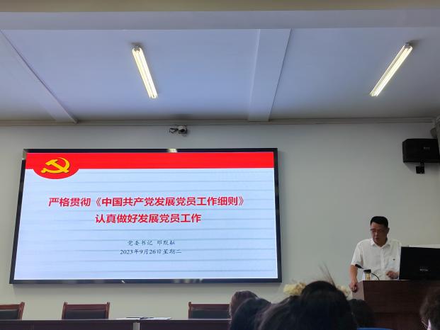 2023年9月26日晚上19:00,计算机学院党委书记邓默耘老师以“严格贯彻《中国共产党发展党员工作细则》认真做好发展党员工作”为题开展了入党积极分子培训班第一次的课程。