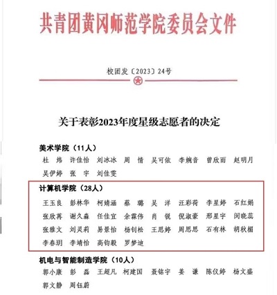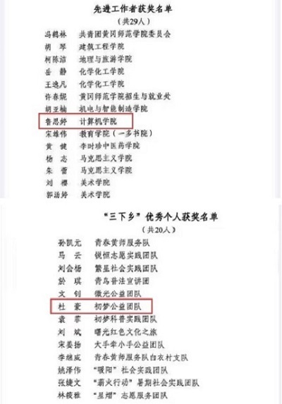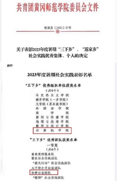 计算机学院荣获2023年度暑期“三下乡”社会实践团队一等奖及优秀组织单位奖。辅导员鲁思婷被授予2023年度暑期“三下乡”暑期社会实践先进工作者称号,软工2102班杜豪被授予2023年度暑期“三下乡”暑期社会实践优秀个人称号。人工智能2101班王玉良等28名学生被授予2023年度一星级志愿者称号,软工2002班张棋等3名学生被授予献全血先进个人称号。