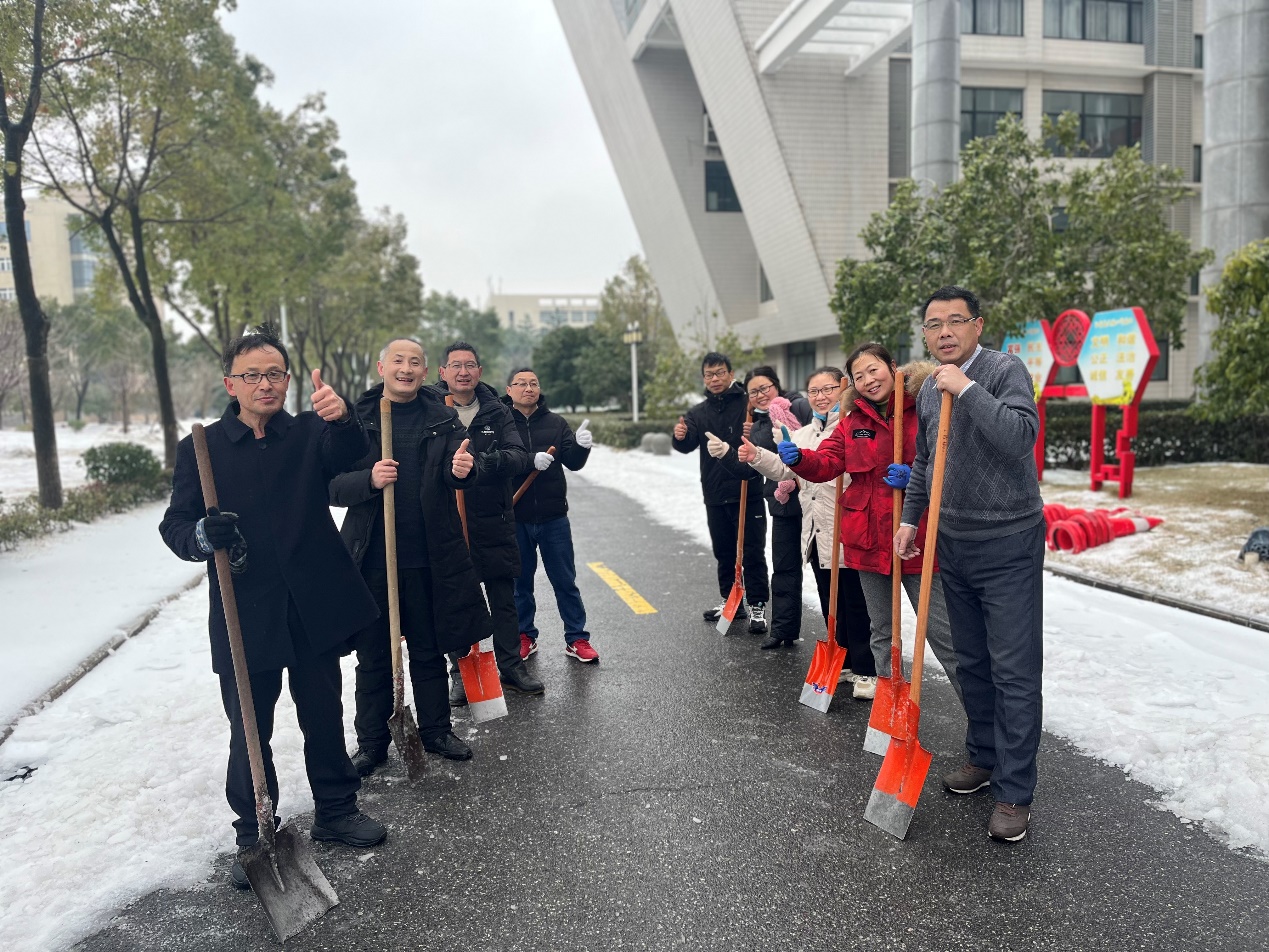 逸夫楼门前,在计算机学院领导班子的带领下,学院教师党员代表们不畏严寒,挥舞着铁锹,分区清扫路上的积雪,大家齐心协力,配合默契,铁锹与地面撞击声不绝于耳。室外温度虽低,但大家以最大的热情,最大的干劲,热火朝天地清除由于低温而冻结的冰层,以切实行动践行党员职责与使命。