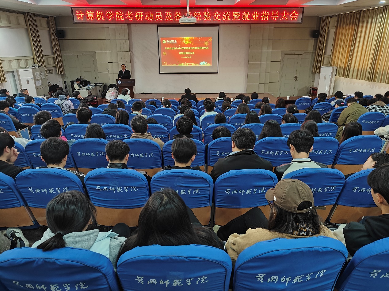为进一步加强学院学风建设,帮助学生认清当前的考研形势,从而明确考研目标,掌握考研技巧,增强考研信心。同时,教育引导学生树立正确的就业观、择业观。2024年3月11日下午,计算机学院在博学楼B03召开考研动员及备考经验交流会暨就业指导大会。学院党委书记邓默耘、院长何中林,辅导员以及2021级各班班主任出席了会议,2021级全体学生参加了会议。