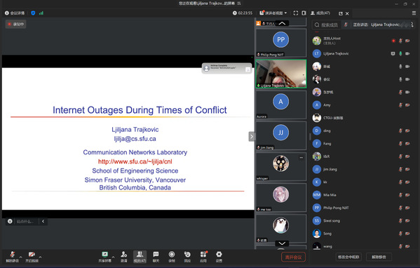 加拿大西蒙弗雷泽大学的Ljiljana Trajković教授在线上报告中分享了题为“冲突期间的互联网中断”的研究,探讨了在突发冲突、自然灾害等紧急情况下,互联网服务中断对社会、经济和人类生活的影响,并讨论了可能的解决方案。