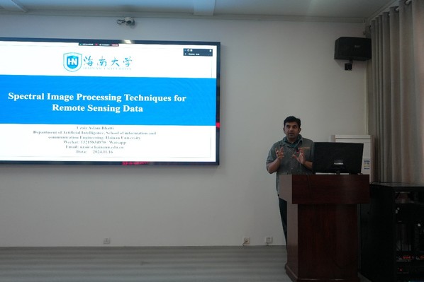 除了国际学者的精彩分享,国内专家的报告也同样吸引了与会者的关注。海南大学的Uzair Aslam Bhatti副教授介绍了“遥感数据的光谱图像处理技术”,讨论了如何通过新型图像处理技术提升遥感数据的分析能力,尤其在自然资源监测和环境保护方面的应用。