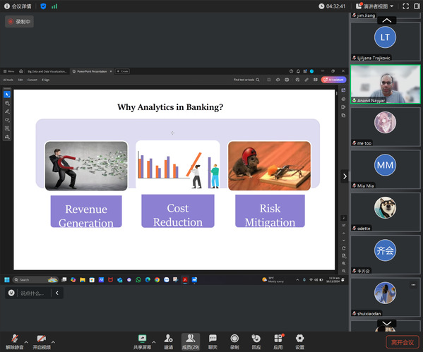 新加坡南洋理工大学的Mile G副教授则通过报告“量子世界中的降维”引发了大家对量子计算及其在数据处理中的潜在应用的深入思考。越南维新大学的Anand Nayyar教授也作了线上报告,主题为“大数据和数据可视化基础知识以及探索银行业数据科学用例”,探讨了大数据分析在金融行业中的广泛应用及未来趋势。