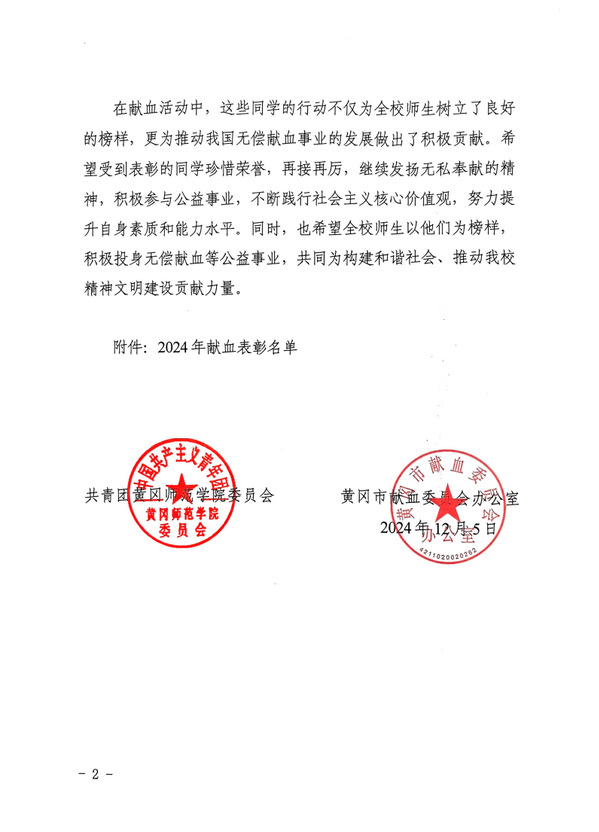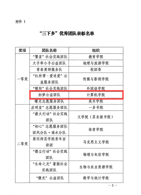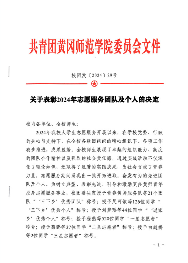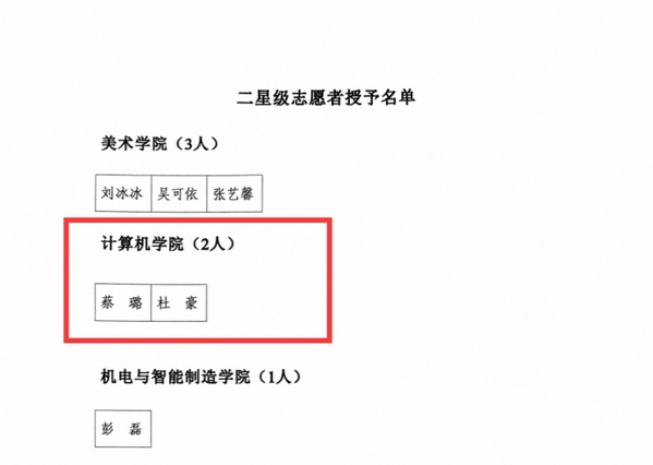 计算机学院荣获2024年度“三下乡”优秀团队一等奖,2024年度无偿献血优秀组织单位。计科2201班蔡璐等6名学生被授予2024年度“三下乡”优秀个人称号。软工2102班杜豪、计科2201班蔡璐被授予2024年度二星级志愿者称号,软工2202班刘星语等26名学生被授予2024年度一星级志愿者称号,软工2101班刘越、软工2303班周全被授予献全血先进个人称号。