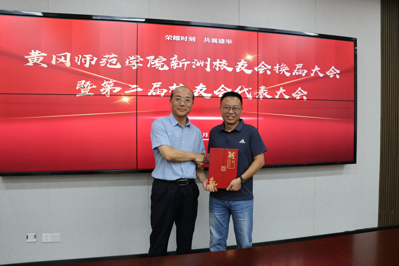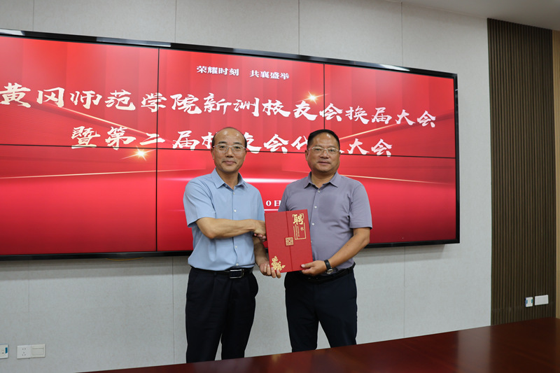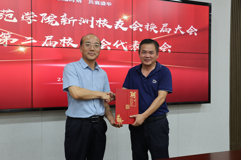 夏庆利向新当选的第二届理事会领导机构成员颁发聘书,并对新洲校友会成功换届表示祝贺。
