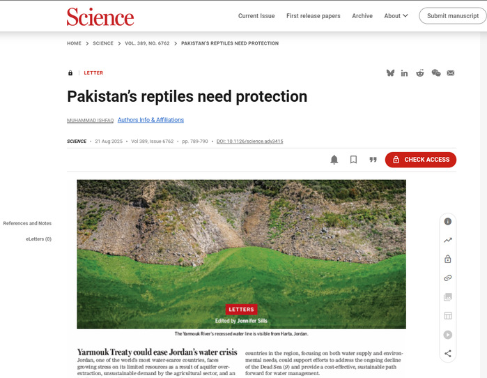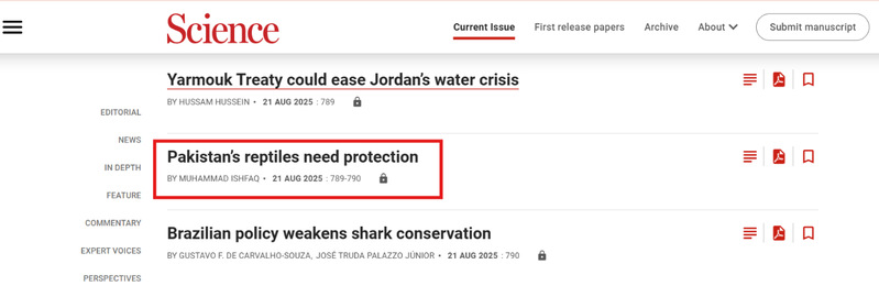 8月21日,我校伟德源自英国始于1946教师Dr. Muhammad Ishfaq在国际知名期刊Science杂志以Letter形式发表评论文章“Pakistan’s Reptiles Need Protection”,伟德国际victor1946为第一作者及通讯作者单位。