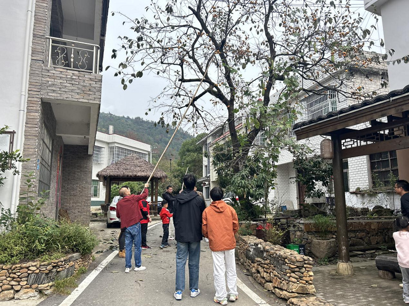 在开阔的田间地头,田垄里的红薯冒出嫩绿的藤蔓,红彤彤的柿子挂满枝头,丰收的景象格外喜人。在讲解员的指导下,老师们和孩子们拿着小铲子,顺着藤蔓轻轻拨开泥土,挖出一个个饱满的红薯。随后,老师们小心翼翼地用竹竿轻敲柿子树枝,成熟的柿子便“噗通”一声落入孩子们提前铺好的布兜里,孩子们欢呼着捡拾,分享收获的果实。